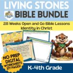 This 6-month Living Stones Bible Bundle is a digital download K–4th grade Christian homeschool curriculum featuring 28 weeks of open-and-go Bible lessons focused on identity in Christ, with 377 pages of no-prep printable worksheets, student journal pages, Scripture reading activities, reflection prompts, and prayer guides that help children independently or with parent support read God’s Word, look up verses, and grow in godly character at home.