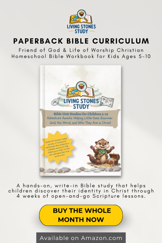Living Stones Study: Month One Paperback is the physical workbook edition of the first month of Living Stones Study, created for Christian homeschool families who want a hands-on way to help children engage God’s Word. This four-week Bible study leads children through meaningful lessons that help them explore their identity in Christ through Scripture, guided reflection, creative activities, and practical application.